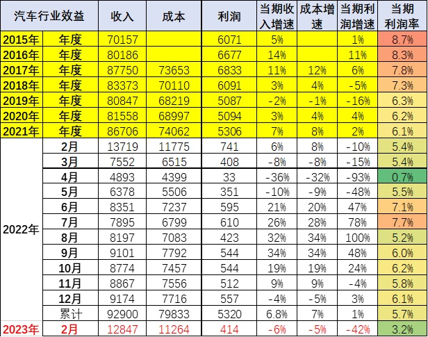 智通财经APP获悉,3月30日,乘联会发表题为“2023年汽车行业效益下降42%的原因分析”的文章。其中称,近期汽车行业生存压力巨大。2023年1-2月汽车行业收入12,847亿元,同比下降6%;成本11,264亿元下降5%;利润414亿元,同比下降42%,汽车行业利润率3.2%,相对于整个工业企业利润率4.6%的平均水平,汽车行业仍属偏低。造成汽车行业利润剧烈下滑的原因是多元的,主要是汽车生产受到春节和库存偏高因素影响下降14%,而新能源车渗透率达到28.7%,同比增长8个百分点,带动利润结构的变化。