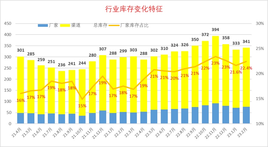 2023年1月月末全国乘用车库存333万辆,其中厂商库存72万辆,渠道库存261万辆。厂商库存占比22%,较去年1月提升5个百分点。