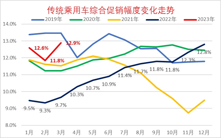 传统燃油车的促销在2023年2月收缩后,3月又开始大幅反弹到12.9%,2月促销较去年同期增加2.5个百分点。目前达到近期最高位水平。