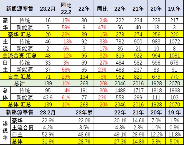 2023年1-2月的国内新能源零售77万辆,增长23%较强。而燃油车零售下降30%的利润损失大。稳定传统燃油车销售对稳定车市增长的意义重大。