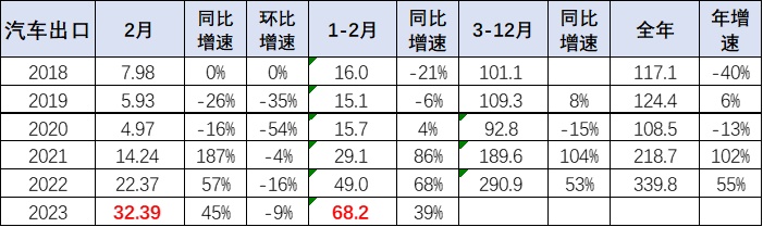2023年1-2月中国汽车出口68万辆,同比增长39%,表现超强,相对于国内汽车销量的低迷,出口市场的表现仍是较强的。今年的主要动力仍是俄乌危机下俄罗斯市场的国际品牌全面被中国车替代和中国新能源出口竞争力提升。