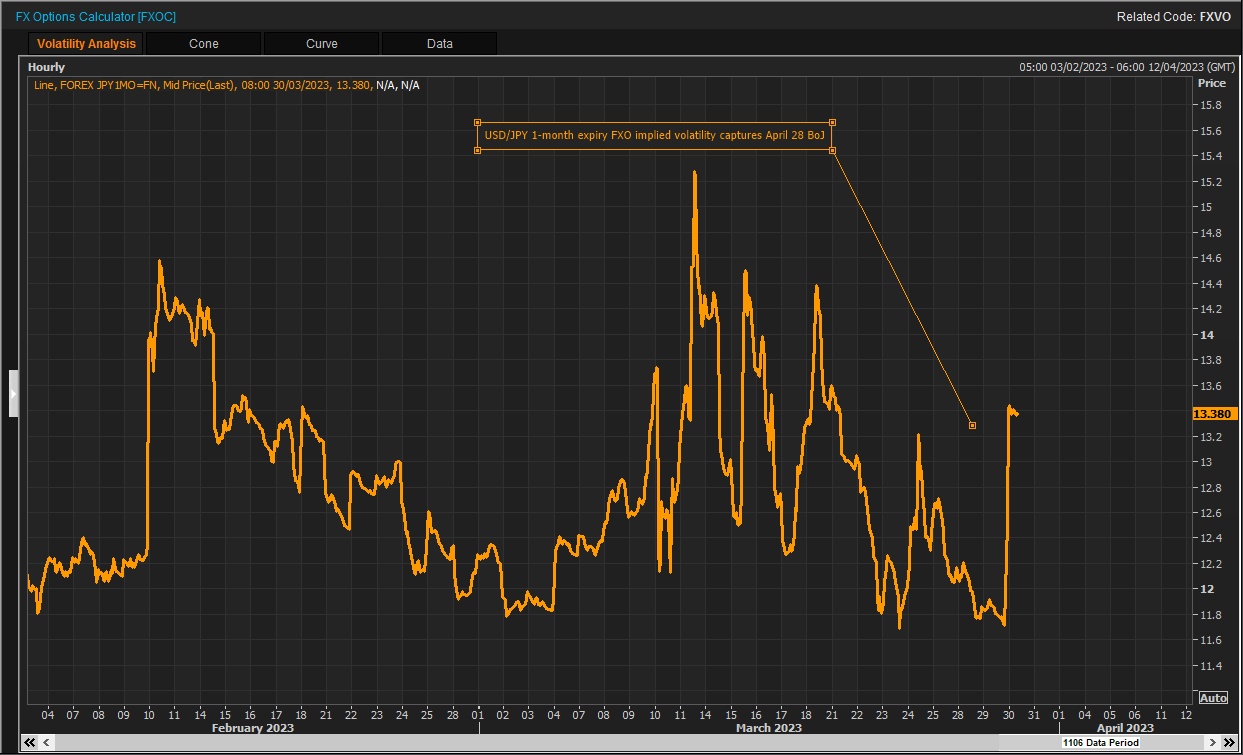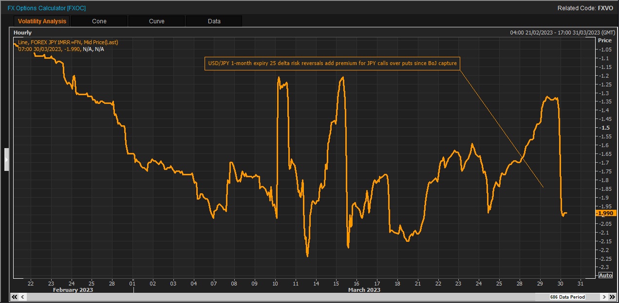 此外,根据衡量日元预期走向的1个月25delta风险逆转指标显示,日元兑美元看涨期权溢价从1.3跃升至2.0。这一价格走势清楚地表明,期权交易员仍然预期日本央行将在4月改变其收益率曲线控制(YCC)政策,而这可能导致日元走高。