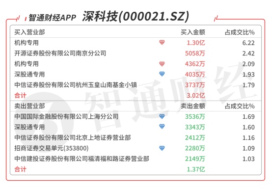 深科技(000021.SZ):受到众多机构青睐,今日共2个机构席位出现在龙虎榜单上,合计净买入1.73亿元,深股通对倒买入692万元,当日净买入1.95亿元,该股今日强势反包,持续上升需放量。