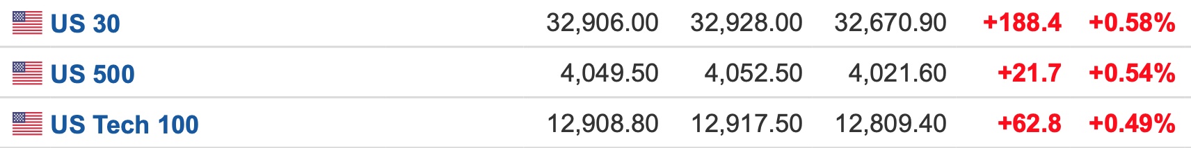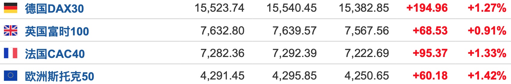 2.截至发稿,德国DAX指数涨1.27%,英国富时100指数涨0.91%,法国CAC40指数涨1.33%,欧洲斯托克50指数涨1.42%。