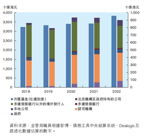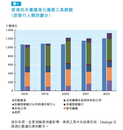 截至2022年底,未偿还港元债务工具总额为13,244亿港元(1,699亿美元),升幅9.6%。