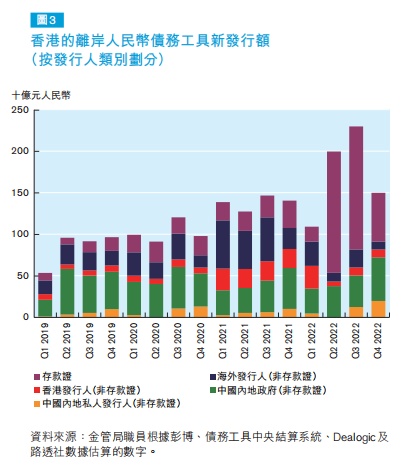 香港离岸人民币债券市场在2022年继续增长,发行额按年增加24%,至6,880亿元人民币(997亿美 元)。增长主要受益于离岸人民币存款证发行额迅速增长(增幅255%),抵销非存款证债务工具发行额减少的影响。因此,截至2022年底未偿还离岸人民币债务工具总额按年上升40%,至9,493亿元人民币。