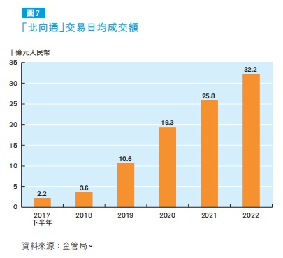债券通“北向通”继续是境外投资者进入内地在岸债券投资的主要渠道,占境外投资者在内地银行间债券市场年度总成交额的61%。年内“北向通”交易显着增长,日均成交额较2021年增加25%至超过320亿元人民币。