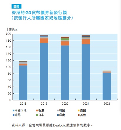 各大央行在2022年史无前例的加息行动,促使全球G3货币债券市场大幅收缩。在香港发行的G3货币债券跟随整体区内市场走势,按年减少54%,至892亿美元。尽管如此,香港仍然稳占亚洲区G3货币债券发行额的最大比重(逾30%)。截至2022年底,香港的未偿还G3货币债券总额为7,169亿美元。