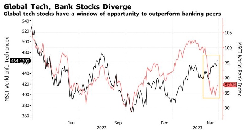 并非只有美国的科技公司从美联储的宽松政策中获益。最近,银行股下跌,而科技股上涨。自3月初以来,全球科技股的表现一直优于银行股,而去年的表现基本一致。