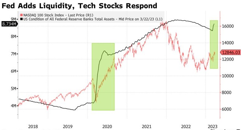 下图显示了美联储的宽松政策对科技股的影响极其巨大。去年美联储开始收紧政策时,科技股陷入了困境。最近,在美联储的资产负债表也扩大了4000亿美元的同时,纳斯达克100指数上涨10%。很明显,如果美联储继续增加流动性,科技股将继续上涨。
