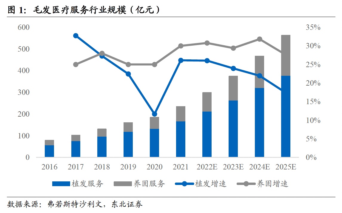 根据弗若斯特沙利文的资料,2021年我国毛发医疗服务行业的总体规模在234亿元,其中植发、养固细分市场的规模分别为169亿元、65亿元,预计至2025年植发、养固细分市场规模将分别达到300亿元、140亿元,增速依然可观。