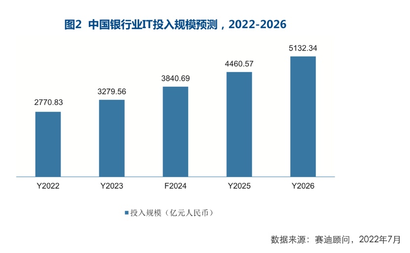 赛迪顾问认为,未来三到五年,中国银行业在IT架构转型叠加自主创新的带动下,将持续 引发新一轮的软硬件等IT基础设施的升级与重构,中国银行业IT投资将会继续保持稳健的增长态势。 预计到2026年,中国银行业IT整体投入将达到5132.34亿元,五年复合增速为16.66%;中国银行业IT解决方案市场规模将达到1390.11亿元,五年复合增速为23.55%。