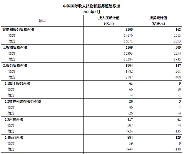按美元计值,2023年2月,我国国际收支货物和服务贸易出口2515亿美元,进口2353亿美元,顺差162亿美元。