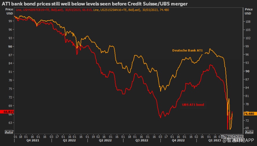 Tradeweb数据显示,德意志银行AT1债券目前交易价格为面值的74%,脱离上周约67%的低点,但仍低于瑞信AT1债券减记前的水平。瑞银AT1债券的情况与此类似,交易价格约为面值的64%。