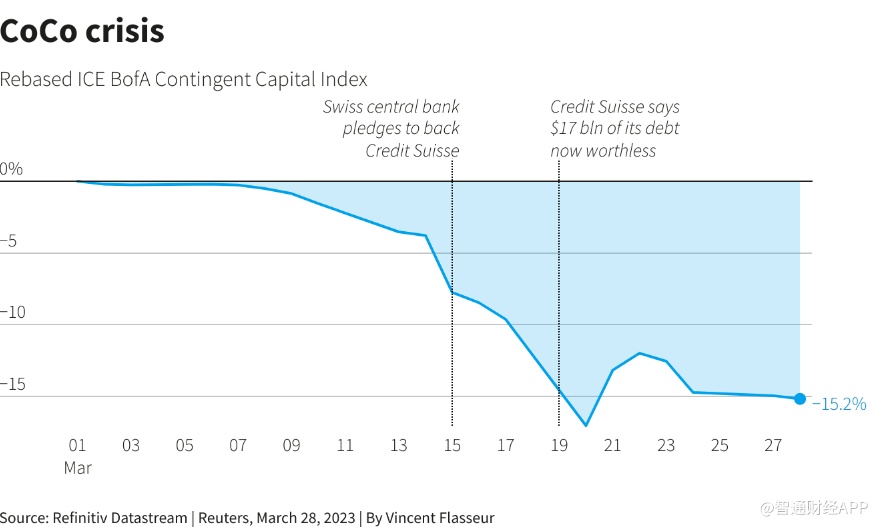 追踪银行AT1债券的WisdomTree交易所交易基金在过去两周下跌了11%。在瑞信接受救助之前,瑞信AT1债券在该基金中所占比例不到3%。