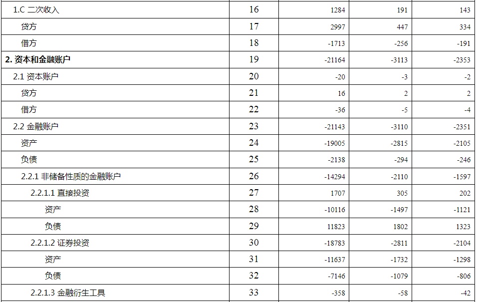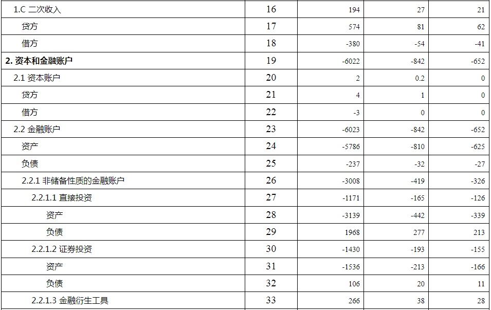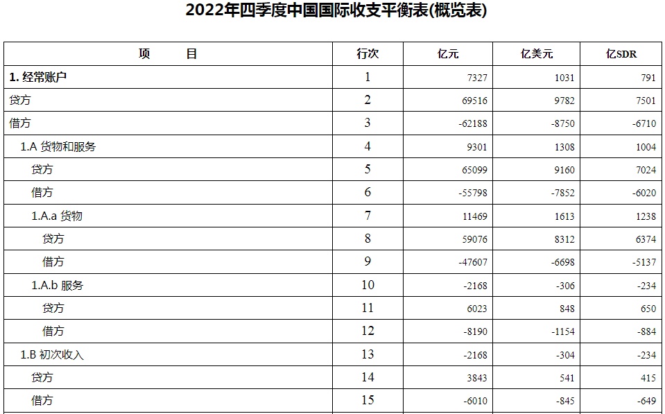 按美元计值,2022年四季度,我国经常账户顺差1031亿美元,其中,货物贸易顺差1613亿美元,服务贸易逆差306亿美元,初次收入逆差304亿美元,二次收入顺差27亿美元。资本和金融账户逆差842亿美元,其中,资本账户顺差0.2亿美元,非储备性质的金融账户逆差419亿美元,储备资产增加423亿美元。