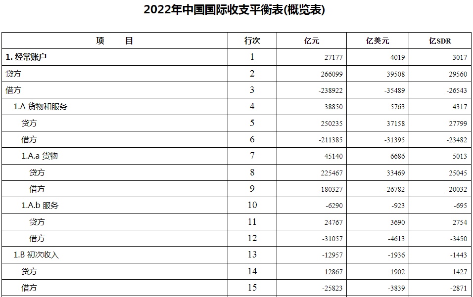 按美元计值,2022年,我国经常账户顺差4019亿美元,其中,货物贸易顺差6686亿美元,服务贸易逆差923亿美元,初次收入逆差1936亿美元,二次收入顺差191亿美元。资本和金融账户逆差3113亿美元,其中,资本账户逆差3亿美元,非储备性质的金融账户逆差2110亿美元,储备资产增加1000亿美元。