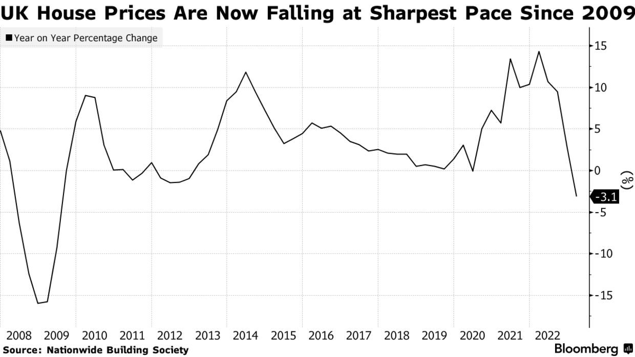 智通财经APP获悉,英国最大的抵押贷款机构之一表示,由于利率飙升推高了借贷成本,英国房价出现自2009年以来最大幅度的同比下跌。全英房屋抵押贷款协会(NBS)周五公布的数据显示,英国3月Nationwide房价指数同比下降3.1%,降幅高于经济学家预期的2.2%;平均房价较去年8月的峰值下降了4.6%,至257,122英镑(318,320美元)。此外,伦敦房价较上年同期下跌4.1%,均价为511,293英镑。