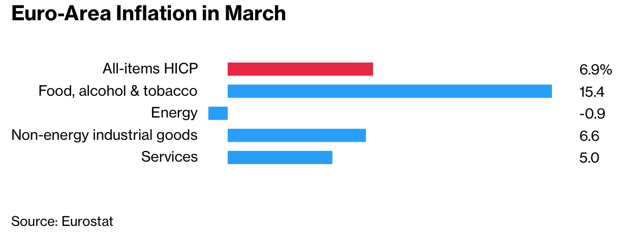 智通财经APP获悉,周五公布的数据显示,欧元区3月整体CPI同比涨幅从上个月的8.5%回落至6.9%,低于市场预期的7.1%。不过,剔除食品能源烟酒的核心CPI同比涨幅则从上个月的5.6%升至5.7%,创下历史新高。这些数据表明欧元区通胀仍居高不下,给坚持收紧货币政策的欧洲央行官员提供了支持。