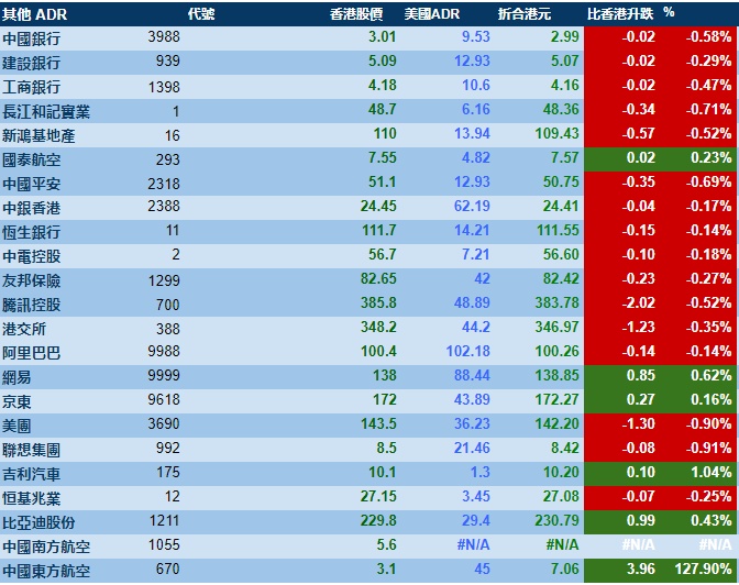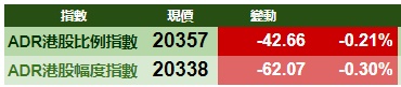 智通财经APP获悉,周五,美股三大指数均涨超1%,港股ADR指数下跌,按比例计算,收报20357点,较香港收市跌42.66点或0.21%。