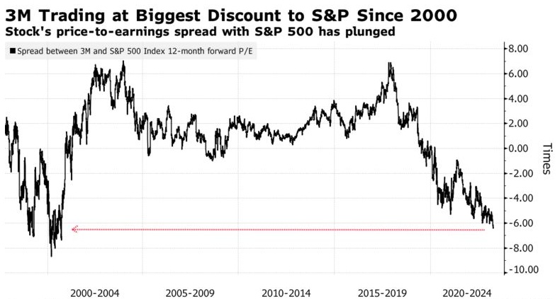 该公司的股价反映了这种悲观情绪。该股目前的预期市盈率约为12倍,而道琼斯指数的预期市盈率约为17倍,标普500指数为18倍。根据媒体汇编的数据,3M与标普500指数之间的市盈率差距达到2000年以来的最大水平。