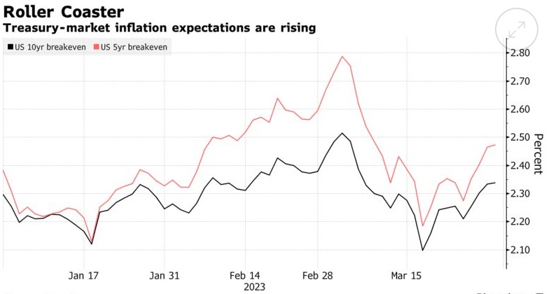 投资者正在为通胀寻求保护,因为他们预计美联储将过早放弃维持物价稳定的努力,转而支维护金融稳定。利率交易员认为,银行业的动荡将导致美联储很快暂停长达一年的加息行动,随后将降息。在这样的背景下,通货膨胀可能会再度升温。过去几周,对通胀的担忧已经刺激了市场对美国通胀保值债券(TIPS)的需求。