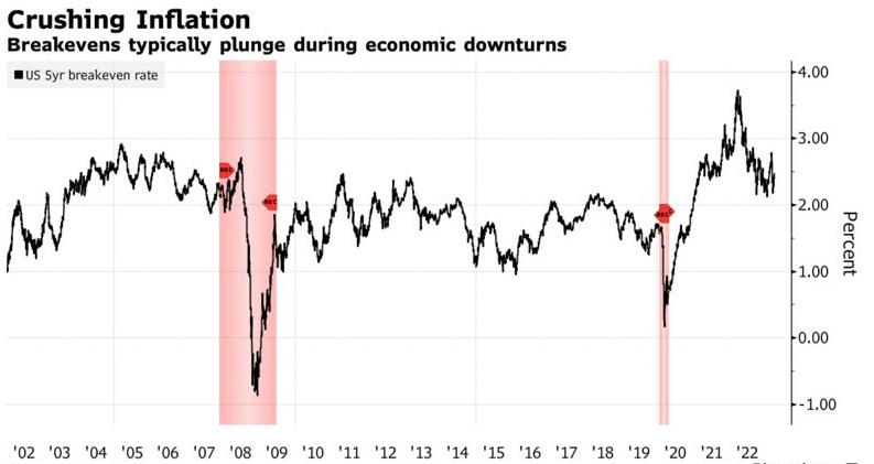 以史为鉴,在衰退中,债券市场可能会将盈亏平衡利率压低至远低于2%的水平,就像本世纪初、2008年和2020年所见的那样。当然,交易员们需要弄清楚,经济衰退是否真的能消除40年来最高的通胀压力。