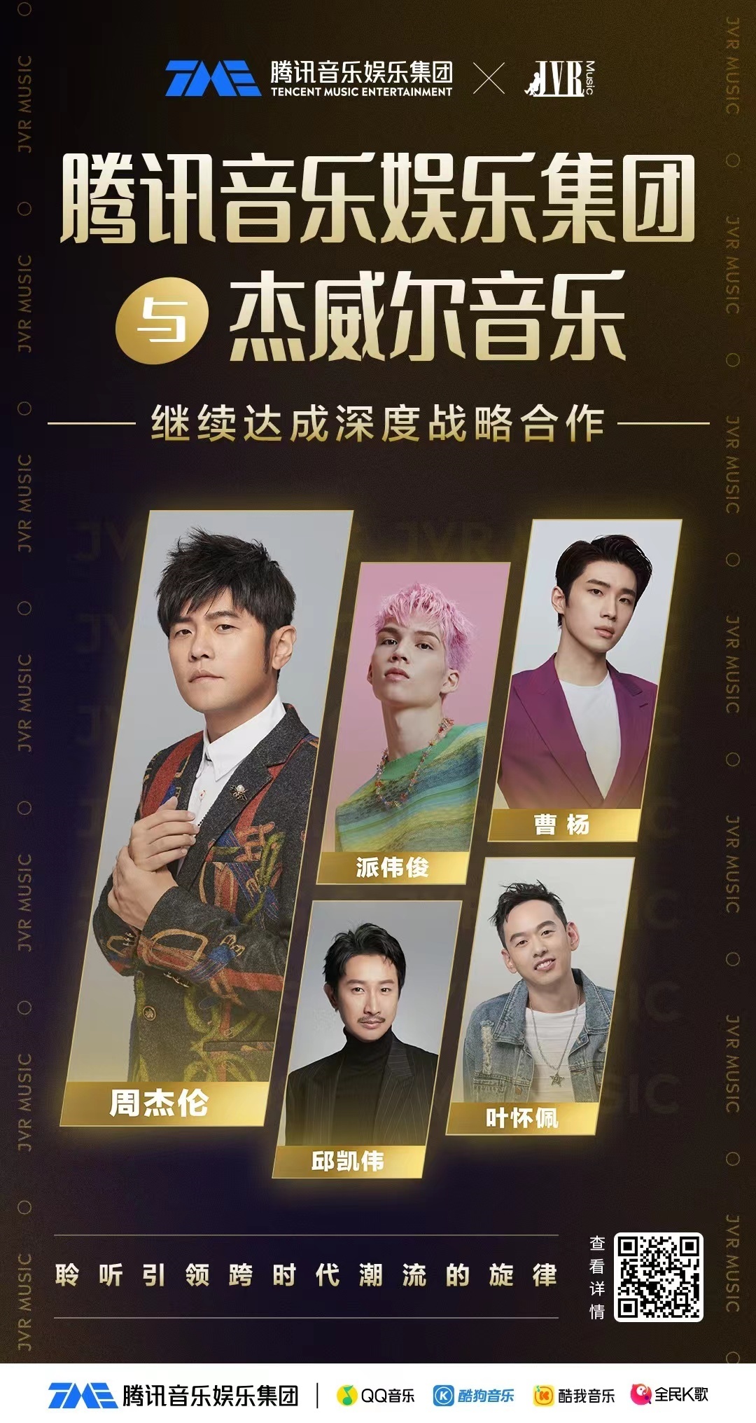 腾讯音乐也将通过旗下QQ音乐、酷狗音乐、酷我音乐等在线音乐平台,以及包括在线K歌平台全民K歌等社交娱乐平台在内的多元场景,继续为用户提供两机构旗下知名艺人的作品。