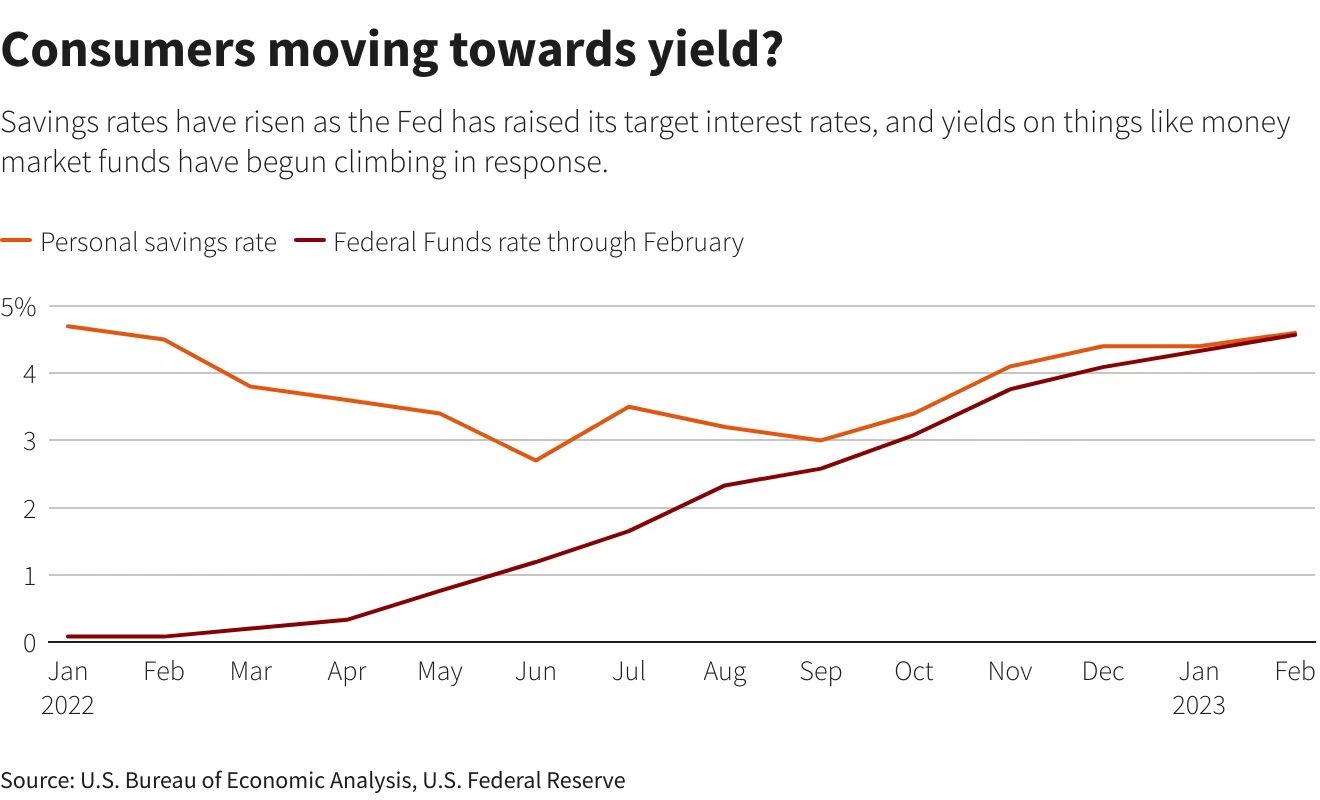 例如,个人储蓄率已从3%稳步上升至4.6%,这是新冠疫情时期的最低水平,同时远低于近年来的水平,这是对储户现在可以从货币市场基金和其他短期现金账户上获得更高收益的教科书式反应,而用于消费的可支配收入有所减少。