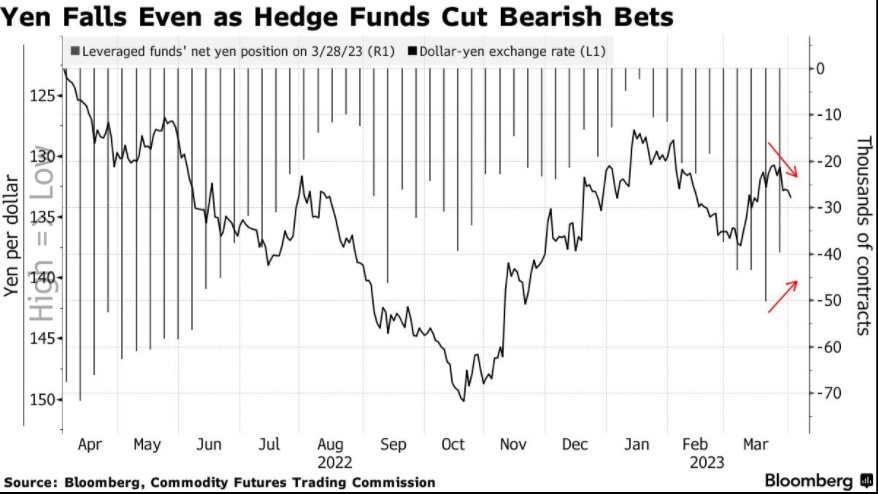 智通财经APP获悉,对冲基金再次踏错节奏,在定位转向不那么看空之际,日元下跌。并且,短期或指向进一步下跌。据商品期货委员会(CFTC)的数据显示,截至3月28日当周,杠杆基金的日元净空头头寸较上周减少了1万份以上(10,574),为11月以来的最高降幅,但日元随后下跌超过1.5%。然而,就在3月中旬日元上涨之际,对冲基金增加了空头头寸。这是自今年年初以来反复出现的一种模式,即对冲基金在大幅改变看空日元的押注后,日元又出现了相反的走势。