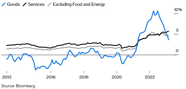现在美联储需面对的主要问题是服务业的通货膨胀,而不是商品的通货膨胀。虽然以这种方式衡量的核心通胀(不包括食品和能源)略有下降,但还不至于让美联储在未来几个月内扭转货币利率方向。