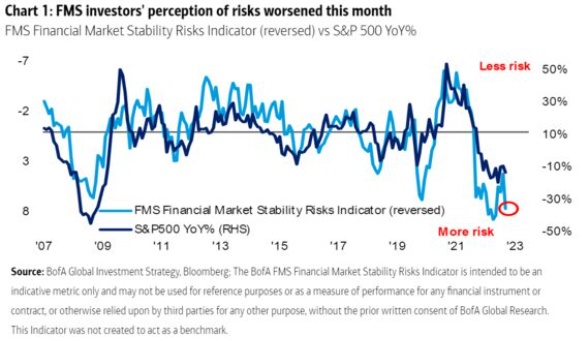市场的悲观情绪主要是出于对金融银行业系统稳定性的担忧。根据美银 3 月对全球基金经理的调查显示,银行业面临的系统性风险急剧增加,现影响行业稳定的潜在风险较2008年金融危机期间的任何时候都高:
