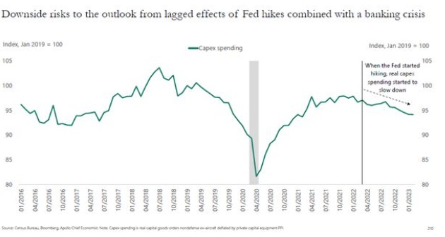 正如 Apollo Management 美国首席经济学家 Torsten Slok 在如下图表中所示,资本支出 (capex) 已开始下降。随着时间的推移,这可能会产生负面的乘数效应,这有利于战胜通货膨胀,但对经济活动或企业收入和利润来说并不是那么积极:
