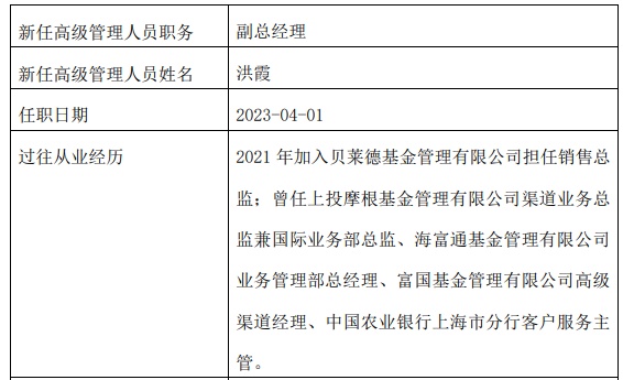 智通财经APP获悉,4月3日,贝莱德基金发布高级管理人员变更公告,新任杨怡、洪霞为副总经理,任职日期均为2023年4月1日。
