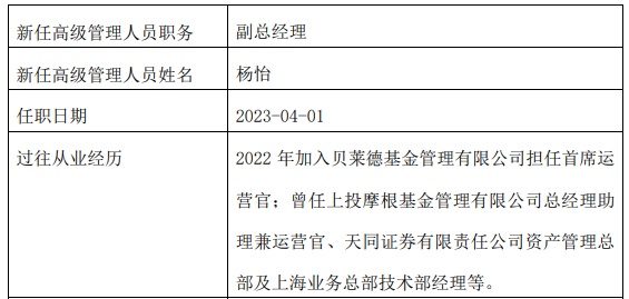 公告显示,杨怡2022年加入贝莱德基金管理有限公司担任首席运营官。曾任上投摩根基金管理有限公司总经理助理兼运营官、天同证券有限责任公司资产管理总部及上海业务总部技术部经理等职位。