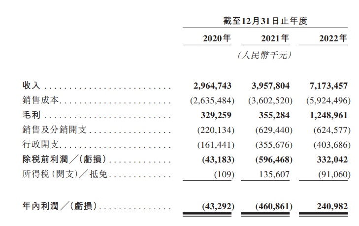 财务方面,于2020年、2021年及2022年,该公司分别实现收入人民币29.65亿元、39.58亿元及71.73亿元;同期,年内分别实现亏损人民币4329.2万元、亏损4.61亿元及利润2.41亿元。