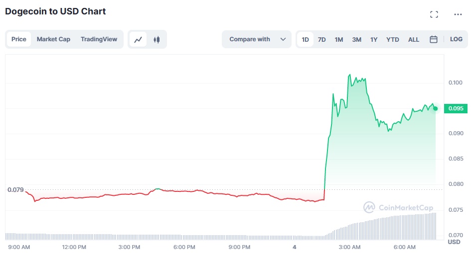 智通财经APP获悉,美东时间4月3日(周一),推特首席执行官埃隆·马斯克将推特用户的官方主页键上方的蓝色小鸟推特标志改为一个柴犬的卡通头像。受此影响,马斯克此前多次力捧的狗狗币周一盘中一度涨30%。截至发稿,狗狗币最近24小时涨幅超过20%。