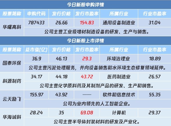自选哥提示,今日沪深两市有华曙高科申购,国泰环保、科源制药、云天励飞、华海诚科等4只新股上市。
