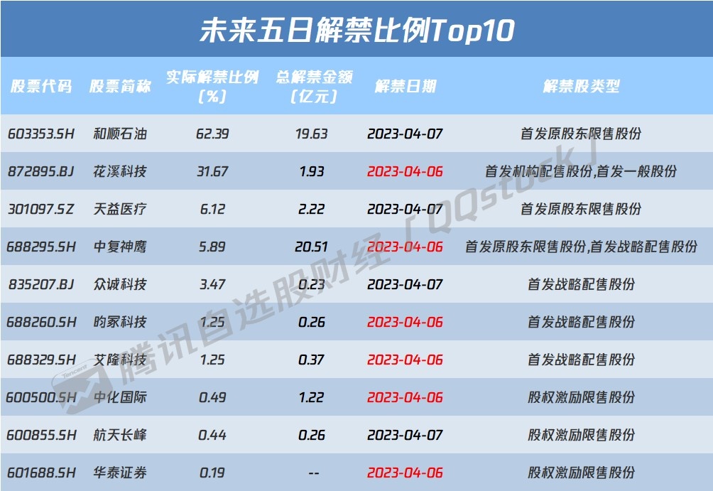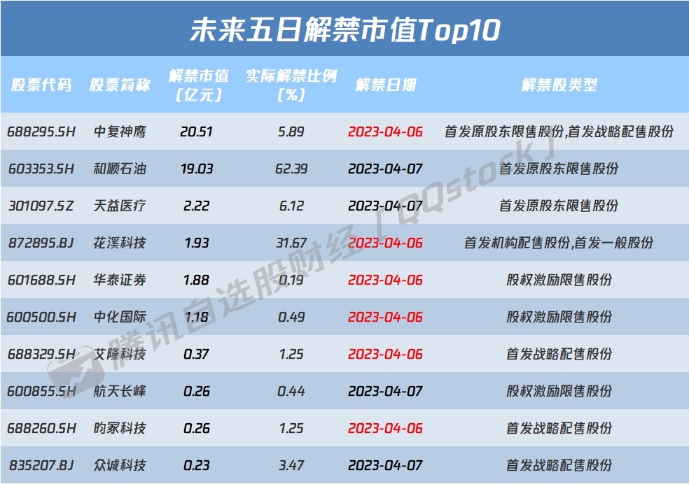 从解禁比例来看,未来五日和顺石油解禁比例达62.39%,其次解禁比例居前的分别为华西科技和天益医疗;从解禁市值来看,中复神鹰、和顺石油、天益医疗等股解禁市值居前。