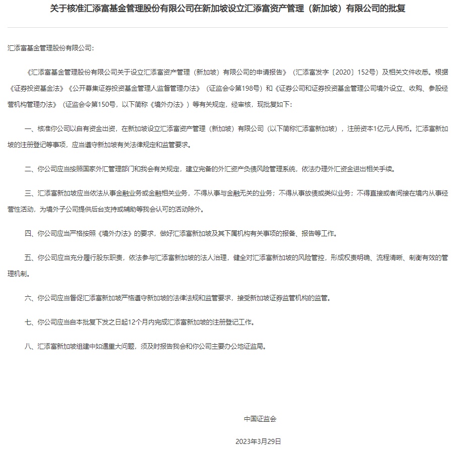 智通财经APP获悉,3月29日,证监会核准汇添富基金在新加坡设立汇添富资产管理(新加坡)有限公司,注册资本1亿元人民币。据了解,汇添富新加坡未来将主要服务分布于环太平洋及中东地区,比如新加坡本地、澳大利亚及东南亚等地区的客户。