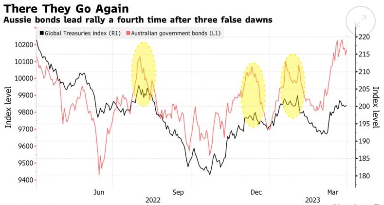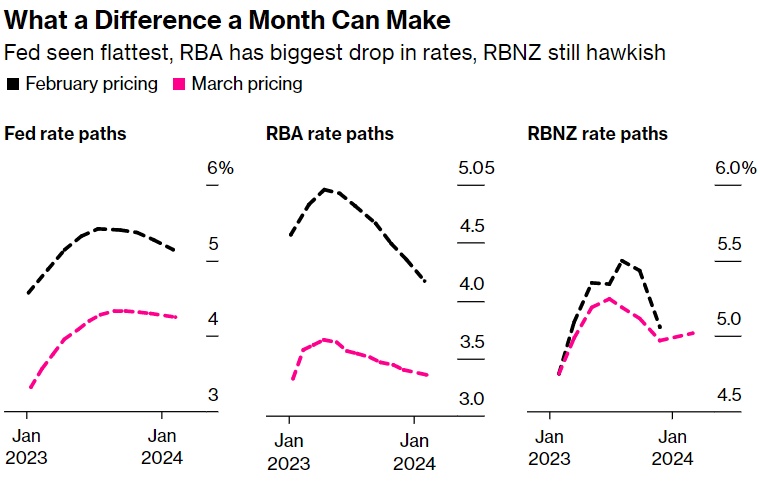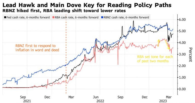 新西兰联储引领了本轮加息周期,是最早表示将加息的央行之一,然后在2021年迅速加息,当时美联储仍在暗示它认为通胀将是暂时的。而澳洲联储2月份的鹰派言论为当月债券市场的暴跌打开了大门,然后在上个月银行危机导致利率预期大幅下跌时,它又转向了另一个方向。