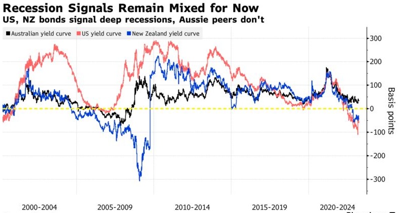 澳大利亚也可能是关键,因为债券投资者给了它一个避免衰退的期望,使其成为全球趋势的指南,值得关注。但美国和新西兰的情况并非如此。在前几次全球经济衰退之前,这三条收益率曲线都是倒挂的。