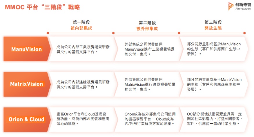 目前,公司AI产品体系统称MMOC平台,由Orion分布式机器学习平台、ManuVision机器视觉智能平台、MatrixVision边缘视频智能平台和Cloud云平台四个部分有机结合。MMOC平台以“数据+算法”为技术核心,支持自动化、低代码技术开发及“云、边、端”一体化部署交付,能端到端支持AI 解决方案创新、研发和交付,为多种AI解决方案的落地提供技术支撑。