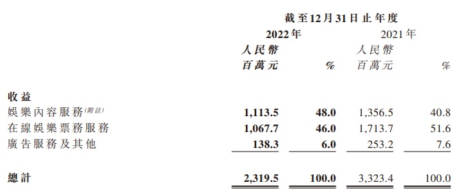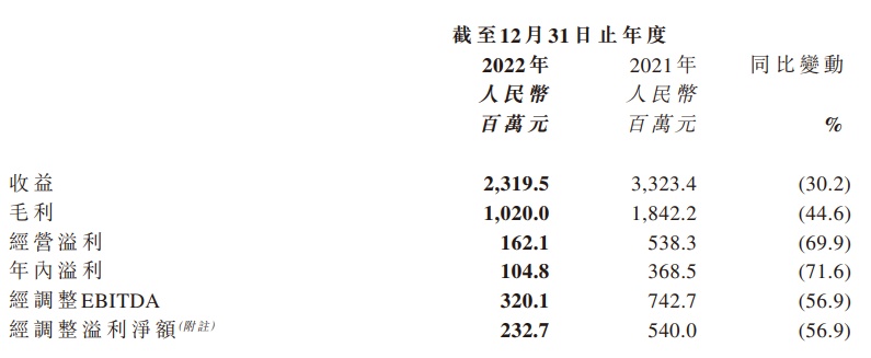 以猫眼娱乐(01896)为例,根据公司日前披露的财报,2022年公司实现收入23.2亿元(人民币,单位下同),同比下滑30.2%;净利润1.05亿元,同比骤降71.6%。核心财务数据全线“回撤”。