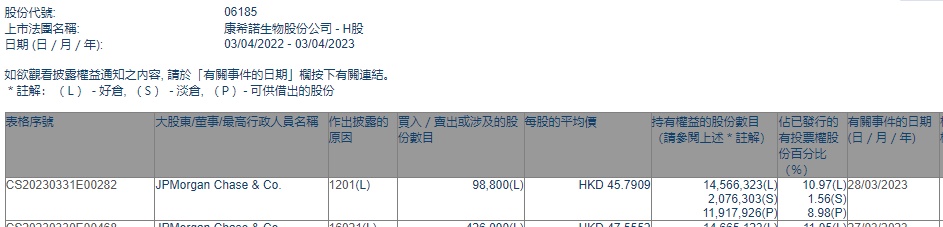 智通财经APP获悉,香港联交所最新资料显示,3月28日,小摩减持康希诺生物(06185)9.88万股,每股作价45.7909港元,总金额约为452.41万港元。减持后最新持股数目约为1456.63万股,最新持股比例为10.97%。