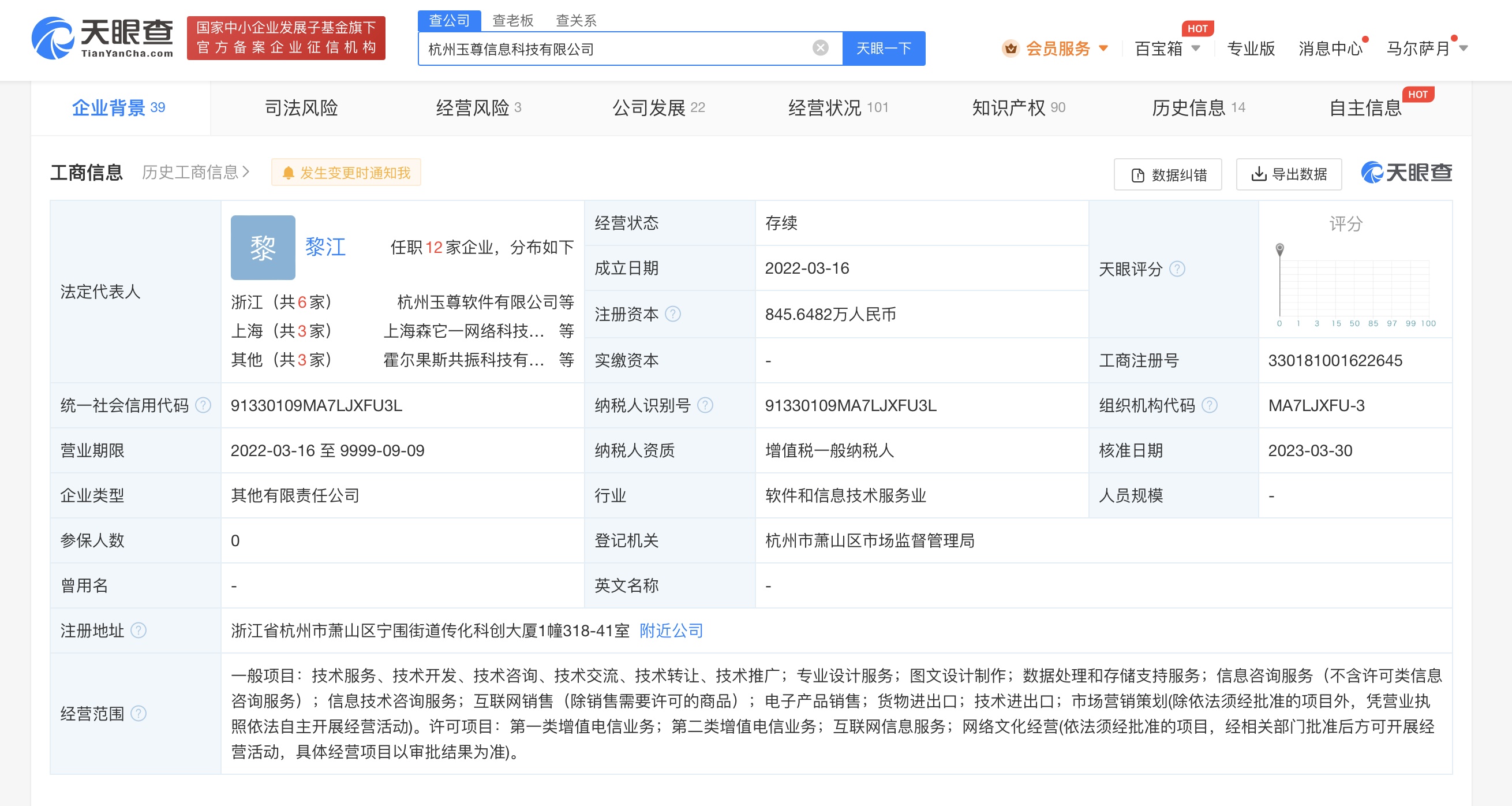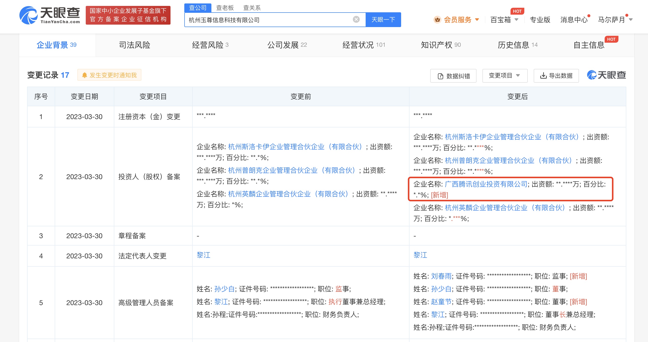 智通财经APP获悉,4月4日消息,天眼查官网显示,近日,杭州玉尊信息科技有限公司发生工商变更,股东新增广西腾讯创业投资有限公司,同时,注册资本由约782万人民币增至约845.65万人民币。公开资料显示,玉尊信息成立于2022年3月,法定代表人为黎江。该公司是一家游戏研发商,致力于开发硬核游戏,为用户提供游戏平台,主要产品《机动战队》即将登陆手机平台。知识产权信息显示,该公司已登记机动战队、钢铁物语、超合金战记、西游战记等多款游戏软件著作权。