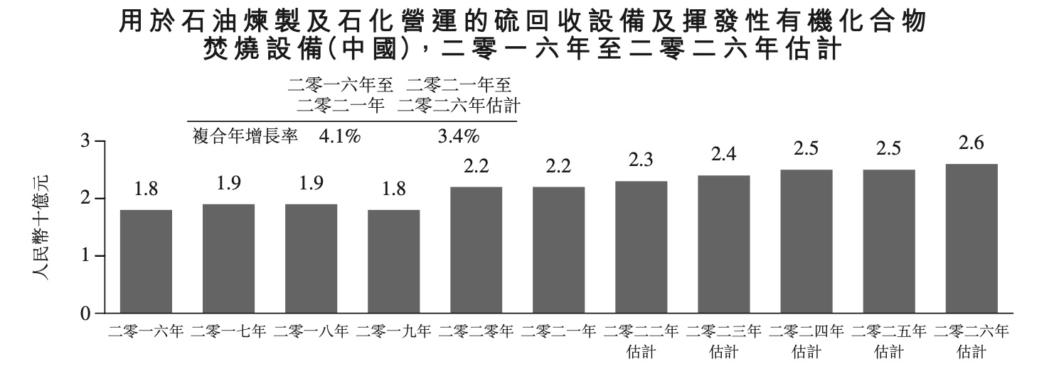 值得注意的是,近年来,硫回收设备及挥发性有机化合物焚烧设备的市场需求正在持续放缓。据弗若斯特沙利文数据显示,受到炼油能力扩大、大型先进石油炼制设备替代低效率的小设备以及国内石化工业的发展所驱动,我国硫回收设备及挥发性有机化合物焚烧设备市场需求由2016年的18亿元增加至2021年的22亿元。预计2026年的市场规模将增长至26亿元,自2021年至2026年的复合年增长率约为3.4%,较2016-2021年4.1%的年复合增长率有所放缓。