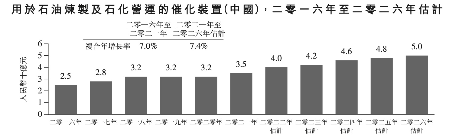 智通财经APP了解到,甲醇制烯烃(MTO)指将甲醇转化为烯烃及汽油等产品所采用的工艺。而催化装置则用于催化石油炼制或MTO反应的过程。考虑到国家能源安全,MTO能力被视为原油的后备力量。MTO设备在中国是一个相对上升的市场,并且是催化装置的主要驱动器。据弗若斯特沙利文数据显示,我国催化装置市场以7.0%的年复合增长率,由2016年的25亿元增加至2021年的35亿元。预计2026年的市场规模将进一步增长至50亿元,自2021年至2026年的复合年增长率上升至7.4%。