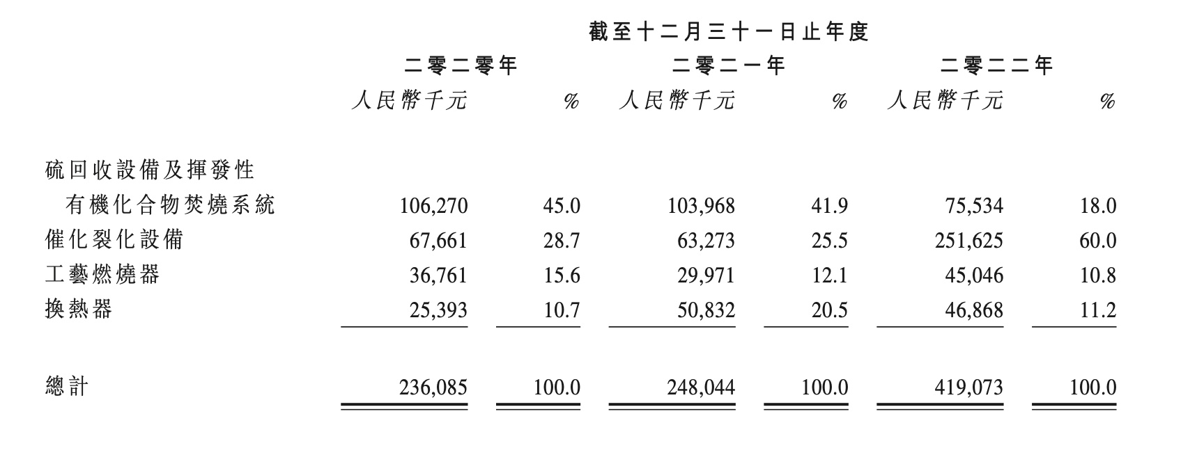 一直以来,来自硫回收设备及挥发性有机化合物焚烧设备为的收入是公司的主要收入来源。不过近年来,来自该业务的营收却持续下滑。报告期内,来自硫回收设备及挥发性有机化合物焚烧设备为的收入分别为1.06亿元、1.04亿元及7553.4万元,占总营收的比例也由2020年的45%下滑至2021年的41.9%,2022年更是进一步下滑至18%。