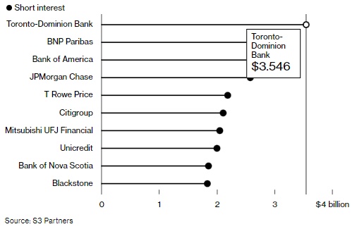 Partners的一份分析报告显示,近几周全球卖空者加大了对多伦多道明银行(TD.US)的看空赌注,目前对其的押注约为37亿美元。这在全球金融机构中是最多的,超过了对法国巴黎银行和美国银行(BAC.US)等的做空。事实证明,全球针对银行业的最大空头赌注既不在瑞士,也不在硅谷,而是在加拿大这个相对温和的金融中心。
